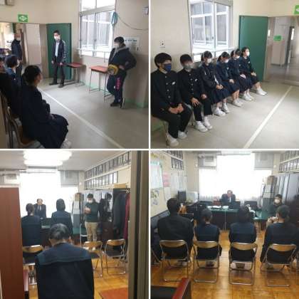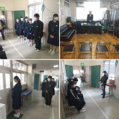 先週の7日(火)に続いて、今日(15日)の5時限目は3年2組のグループ面接を校長室にて行いました。初めて校長室へ入室する人がほとんどでしたが、程よい緊張感の中で、事前の面接の心得やマナー講座を生かした校長面接になっていたと思います。