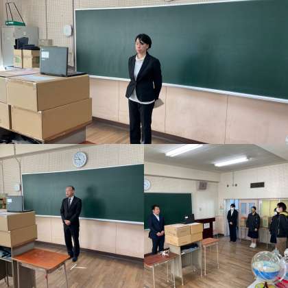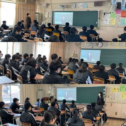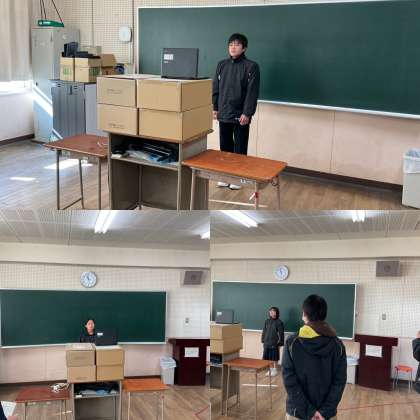 今日(24日)の終業式も全校集会同様、リモートでの開催としました。教務主任の先生の司会で、校長先生からのお話(命を大切に)と生徒指導主事の先生からの冬休みの生活についてのお話、そして、図書委員会からは冬休みを利用して図書館で本を借りた人は始業式から1週間以内に返却しましょうとの連絡と保健委員会からは朝食アンケートの結果について詳しくは3学期に報告しますが、概ね8割以上の人が毎日朝ご飯を食べていることがわかりました。食べていない人は毎日何か食べるようにしましょうとのお話などがありました。最後は、生徒会からの連絡で、今月の生徒議会での話として、学級の状態について1年生は2分前着席ができていない、2年生は授業内での発表者が少ない、3年生は忘れ物、提出物を出していない人がいるとありました。3学期は気を引き締め直し、3学期の生徒議会で同じような話が出ないようにしましょう。とありました。そして、明日から冬休みが始まりますが、冬休みだからと言って夜更かしをするのではなく、早寝早起きを心掛けるようにしましょう。休み明けには1・2年生はチャレンジテストが、3年生は実力テストがありますので復習等を頑張りましょうと訴えていました。
