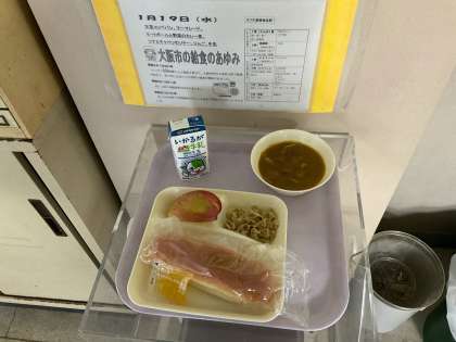 ミートボールと野菜のカレー 煮 ツナとキャベツのソテー りんご 大型コッペパン(マーマレード) 牛乳