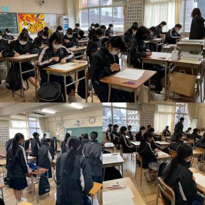 今日(26日)、3年生学年末テストの初日です。先週に比べて幾分寒さも和らぎ過ごしやすくなってきたとはいえ、感染症対策のため窓と廊下のドアを開け、換気をしながら教室でテストを頑張っています。