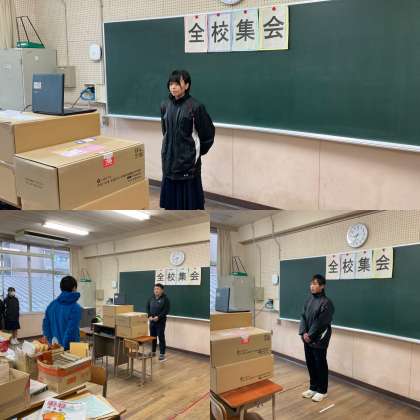 今日(31日)はオンライン全校集会を行いました。1月も今日で終わり4日(金)には立春を迎えます。まだまだ厳しい寒さが続くようですが暦の上では春、オミクロン株の雪解けが待ち遠しいですね。いつものように校長先生から週初めのお話があり、この金曜日には新入生の保護者説明会がいまのところ予定通り行いますと報告がありました。3年生が卒業した後に入学してくる新入生をお迎えする準備、先週の制服採寸等が着々と進められています。とくに蔓延防止等重点措置期間の厳しい状況が続く中ではありますが、生徒会を中心に小中交流交歓会の準備に取り組んでいることに感謝の言葉もありました。続いて、生徒指導主事の先生からコロナ感染のことで、濃厚接触者などで学校に来れない生徒のことを考えて、今学校へ来れている人たちが基本的な感染対策(登校時の手洗い・消毒・マスクを鼻まですること等)をしっかりすることで、今後登校してくる人たちが安心して登校できるようになるし、皆さんも安心して勉強することができるのですとありました。また、今学級や学年で休んでいる仲間の係仕事などは周りの誰かが助け合うような集団を目指していきましょうとのお話しでした。そして、学代委員会からは前回の生徒議会で先月の反省と改善策について話し合われたことの報告がありました。1・2年共通で授業中に居眠りをしたり、友だちと授業に関係ない話をしてしまったり等、授業に入り切れていない人がいます。今の3年生を見本に積極的に授業に参加し、発言をするなど意欲的に取り組んでいることを手本にしていきましょうと改善策についてありました。最後は生徒会から小中交流交歓会の部活動紹介の動画撮影が先週から始まっていますが、まだ撮影が済んでいない部活は練習をしてスムーズにできるようにしましょうとありました。よろしくお願いします。