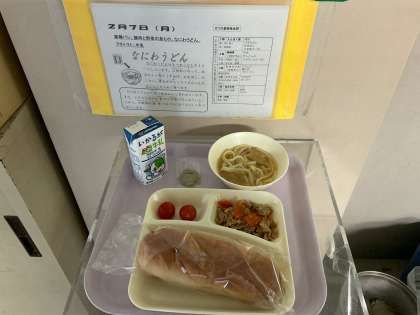 豚肉と野菜の煮もの なにわうどん プチトマト 黒糖パン 牛乳