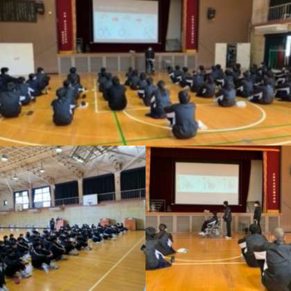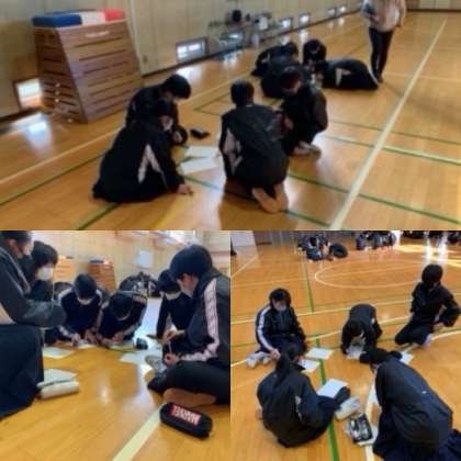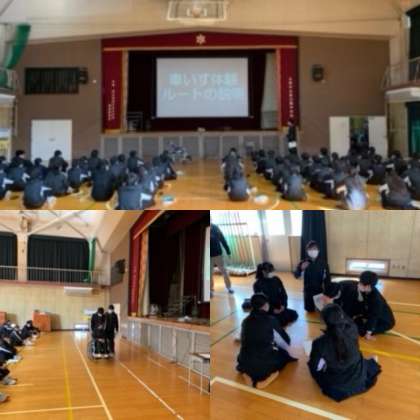昨日(14日)、5・6時限目に今週金曜日に実施する車椅子体験の事前学習を体育館で行いました。基本的な車椅子の扱い方から段差時、上り坂下り坂の操作の仕方など当日実施するルートの確認や横断歩道、細い道、坂道等の注意事項を班で考えてまとめていました。