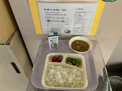 チキンレバーカレーライス きゅうりとコーンのサラダ いちご 牛乳