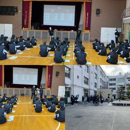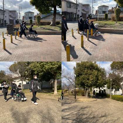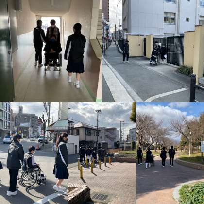 今日(18日)の5・6時限目は2年生が車いす体験にチャレンジをしました。61期生は昨年1月、1年生時でアイマスク体験をし、視覚障がいについての学習をしてきましたが、今回は車いす体験を企画して淀川区社会福祉協議会の協力もあり、10台の車いすをお借りすることができました。校内の2台と合わせての取り組みで、先日の事前学習で学んだ車いすの乗り方と押し方の説明を確認してから生徒たちは、班に分かれて学校周辺地域ルートに繰り出しました。地域ではそれぞれにポイントを作り、学年の先生方がポイントでの安全確認を含め指導をしていました。今日は昨日より天気も良く、多少気温も上がっていたようで目標通りの体験活動ができたと思います。これからも一人ひとり3年生へ進級する準備、心構えをコツコツと積み重ねていきましょう。