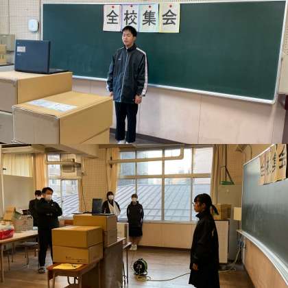 さて、今日の集会では校長先生のお話の後、美化委員会から今月の目標と具体的方策についての連絡がありました。目標は「年度末の大清掃に向けて日ごろから意識を高めよう」で具体的方策は「大清掃に向けて掃除しにくい場所を探す」です。また、3月24日に実施する大清掃に向けて美化委員会ではポスターを作りましたので2月24日から掲示しますとありました。続いて、体育委員からは男子の目標は「声が出せない分きびきびと行動しよう」、女子の目標は「一人ひとりが周りを意識しよう」で、具体的方策は「男女ともに体側や足踏みのことなど周りを意識して合わせる」とあり、今は体育の授業では声を出せないので今まで以上に自分の動きを確認しながら、一つ一つを意識して授業に取り組むようにしましょうと呼びかけていました。