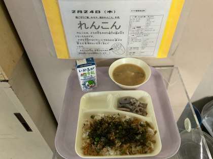 鶏ごぼうご飯 みそ汁 焼きれんこん 牛乳