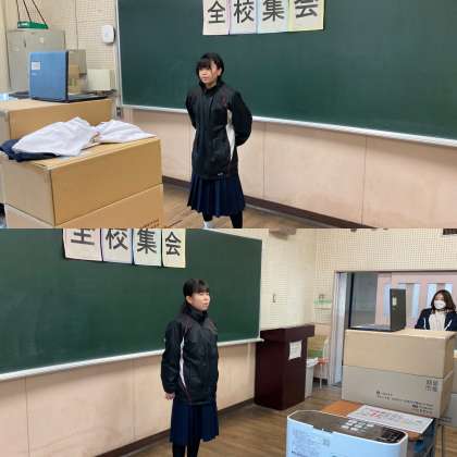 さて、今日は風紀委員会からの連絡がありました。今月の目標と具体的方策についてで、「新1年生のお手本となるようしっかりと大きな声であいさつをしよう」との目標の確認と、具体的方策として「つねに自分の120%の声であいさつをする」に決まりましたと呼びかけていました。朝のあいさつについて、風紀委員がしっかりとあいさつをするので皆さんも大きな声であいさつを返すようにお願いしますと訴えていました。最後に、4日から9日までの服装指導強化週間についてで、前日の3日の終学活で風紀委員がチェック項目を伝えますので各自生徒手帳で確認をしておくようにしましょうとありました。そして、生徒会からは職員室前の落とし物ロッカーに水とうやタオル等の落とし物が届いていますので終業式までに自分のものがないか確認をしておくようにとの話でした。