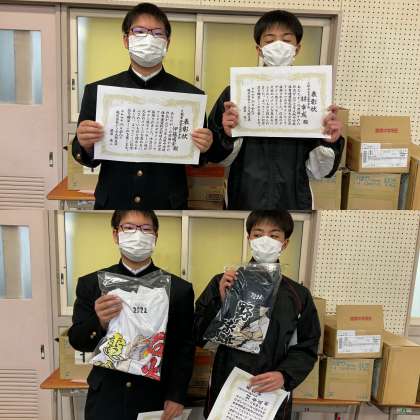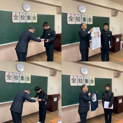 今日(28日)はリモートによるオンライン全校集会がありました。まずは、本校の2名が描いたデザインが2022年大阪中学校軟式野球大会記念Tシャツのデザインに採用され、株式会社トンボ大阪支店から表彰状と記念品が贈られましたので皆さんに紹介と賞状伝達を行いました。久しぶりにコロナ禍での明るい話題に心が和みました。