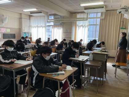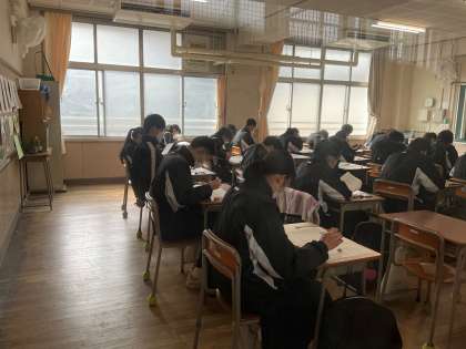 今日(2日)、1・2年生は学年末テストの第2日目です。1限…社会・2限…数学(1年)・英語(2年)、3限…音楽でテスト終了後に終学活、下校です。給食の提供はありません。明日の3日目も頑張りましょう。今年度最後のテスト(理科・技家/美術(2年のみ))です。悔いの残らないようにしましょう。