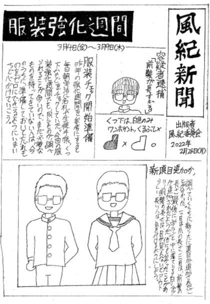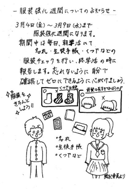 明日(4日)から9日まで学校では服装指導強化週間となっています。普段から身なりを整えて学校生活を送っている皆さんにとってはいまさらという人もいるとは思いますが、3年生にとっては中学校の制服を着るのもあと一週間余りとなってきました。残念ながら明日はもう一日、3年生の学年休業日ですが1・2年生もこの機会に服装をチェックしてほしいものです。生徒会の風紀委員会では風紀新聞も発行してくれています。59期生の皆さん思い出に残る中学校生活、有終の美を飾りましょう。