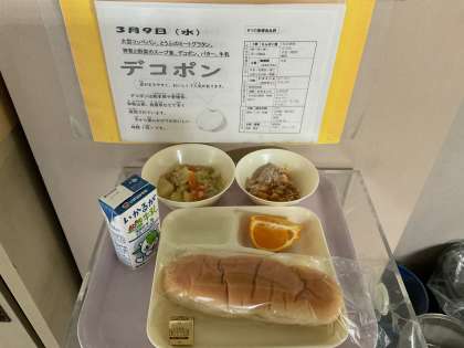 とうふのミートグラタン 押麦と野 菜のスープ煮 デコポン 大型コッペパン (バター) 牛乳