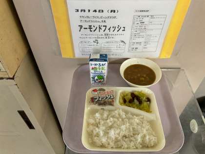チキンカレーライス ビーンズサラダ アーモンドフィッシュ 牛乳