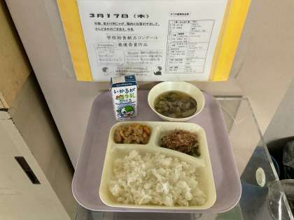 変わり肉じゃが 鶏肉と白菜のすまし汁 さんどまめのごまあえ ごはん 牛乳