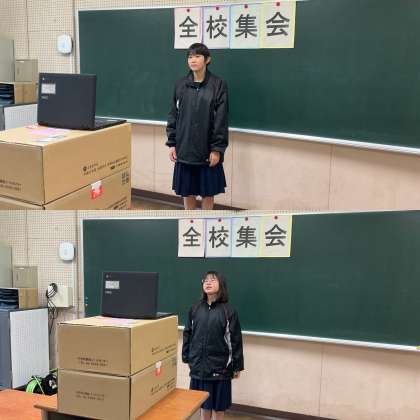 今日の集会ではいつものように校長先生からのお話の後、保健委員会からの連絡がありました。今年度も新型コロナウイルス感染症対策に協力していただきありがとうございます。蔓延防止等重点措置は解除されましたが、まだ感染者数が1,000人を超えるなど油断はできないので、引き続き来年度も感染症対策へ協力をお願いしますとの呼びかけがありました。最後は、生徒会から2つの連絡がありました。1つ目は、落とし物についてで、3月31日に落とし物を処分するので、自分のものがないか、職員室前の保管ロッカーを確認してくださいとのお願いでした。そして、2つ目は3月24日に通知表が手渡されますので、それを踏まえ、次の学年に向けてしっかりと復習、勉強をするようにしましょうとありました。