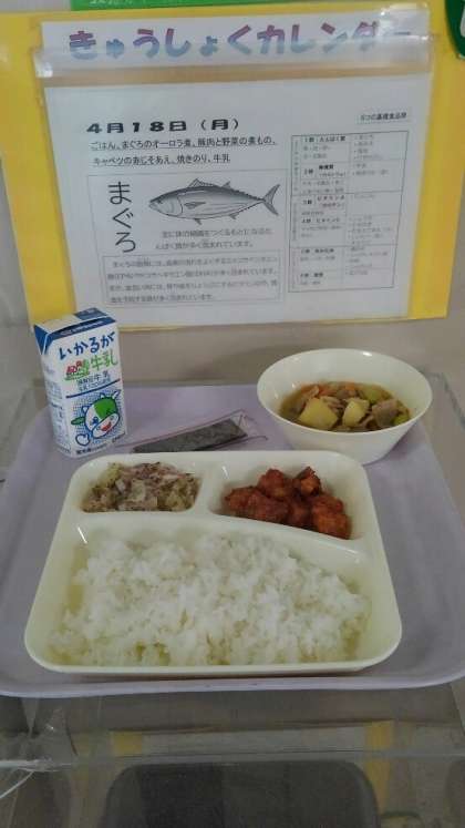 まぐろのオーロラ煮 豚肉と野菜の煮もの キャベツの赤じそあえ