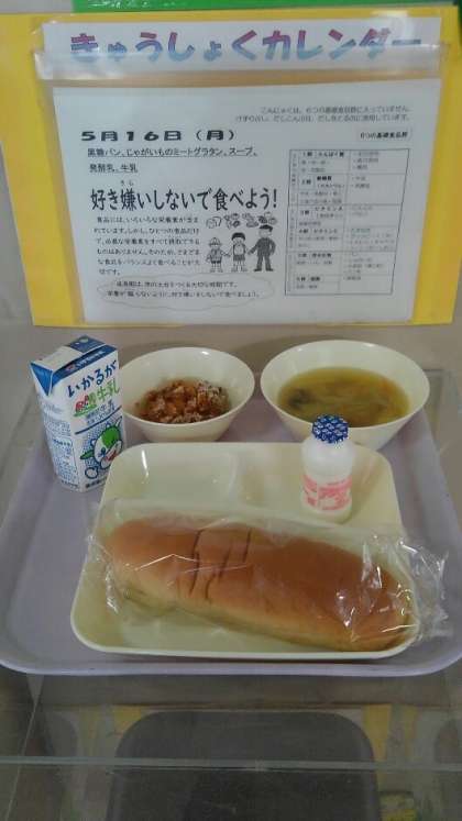 じゃがいものミートグラタン スープ 発酵乳 黒糖パン 牛乳