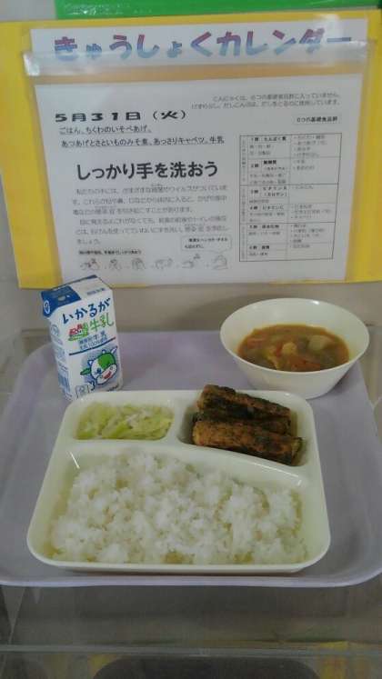 ちくわのいそべあげ あつあげとさといものみそ煮 あっさりキャベツ ごはん 牛乳