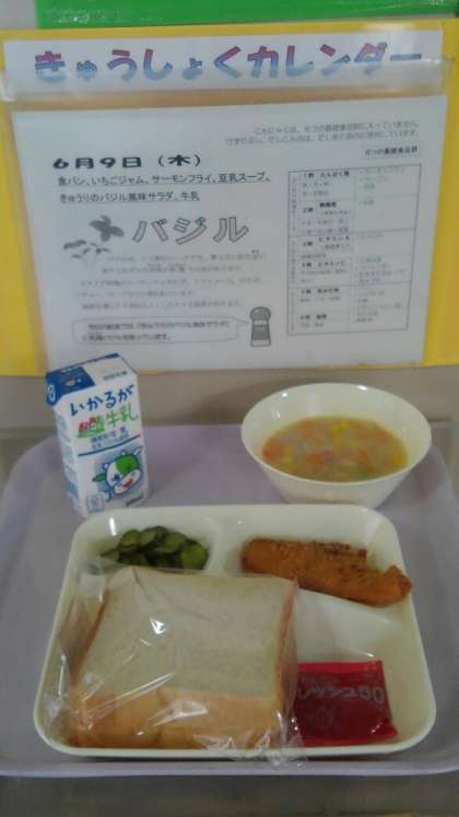 サーモンフライ 豆乳スープ きゅうりのバジル風味サラダ 食パン