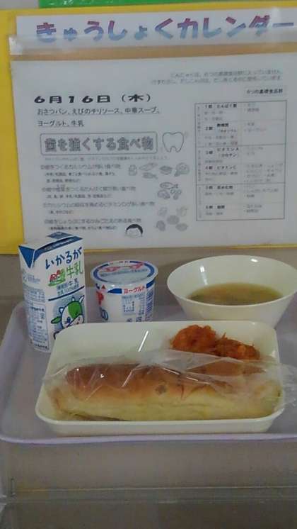 えびのチリソース 中華スープ ヨーグルト おさつパン 牛乳