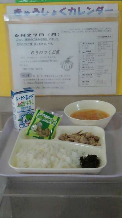 豚肉のごまみそ焼き すまし汁 のりのつくだ煮 まっ茶大豆 ごはん 牛乳