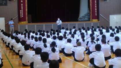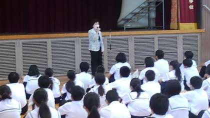 今日のテスト終了後、体育館でジュニアリーダーの結成式を行いました。東三国社会福祉協議会会長の村上さんも来られ、お話をしていただきました。