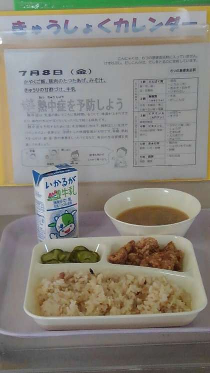 豚肉のたつたあげ みそ汁 きゅうりの甘酢づけ かやくご飯 牛乳