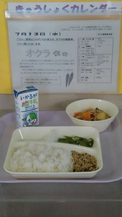 豚肉とじゃがいもの煮もの オクラの梅風味 ツナっ葉いため ごはん 牛乳