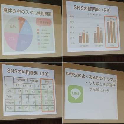今日の終業式で、SNSでどんなトラブルが起こりやすいか、またどうすればそのようなトラブルを防げるかといった内容の話をしています。