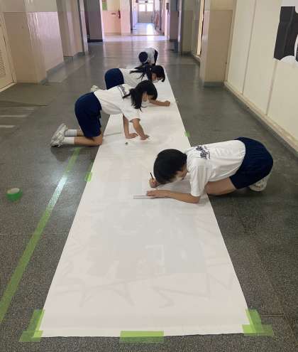 体育大会や文化発表会で掲示される垂れ幕の制作が今週から始まっています。はじめに美術部の生徒が下書きをしてくれました。垂れ幕のサイズがとても大きく、教室の中ではできないので、美術室前の廊下で頑張っています。