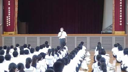 まだ夏休み気分が抜けきっていない人も多いかもしれませんが、今日から2学期のスタートです。2学期には体育大会や文化発表会などの大きな行事があります。3年生にとっては、卒業後の進路決定に向けての重要な時期でもあります。新型コロナ感染症の心配な状況が続きますが、体調管理に気をつけながら、充実した毎日を過ごせるようにしましょう。
