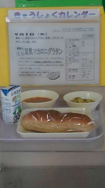 豆乳マカロニグラタン(米粉) トマトスープ 洋なし(カット缶)