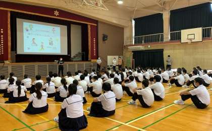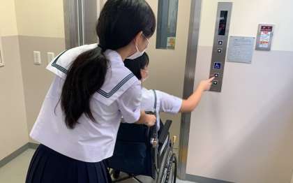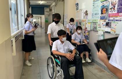 昨日の2年生の取り組みの様子です。それぞれの班で協力しながら、実際に車いすに乗ったり、他の人が乗っているのを介助したりしました。もし、車いすの方を介助する機会があったら、今回の経験を活かせるといいですね!