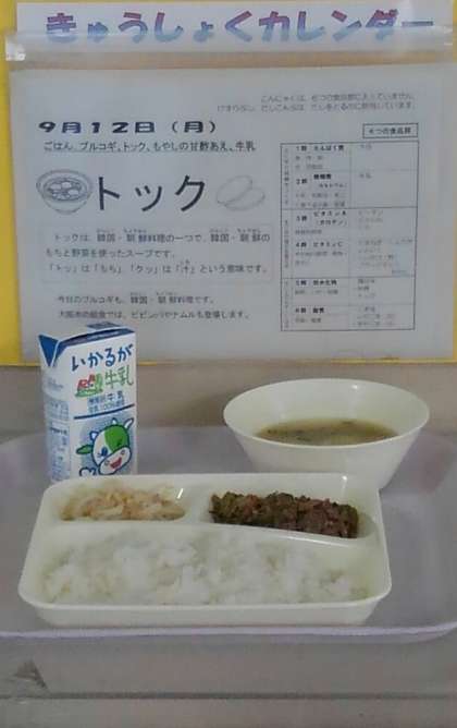 プルコギ トック もやしの甘酢あえ ごはん 牛乳