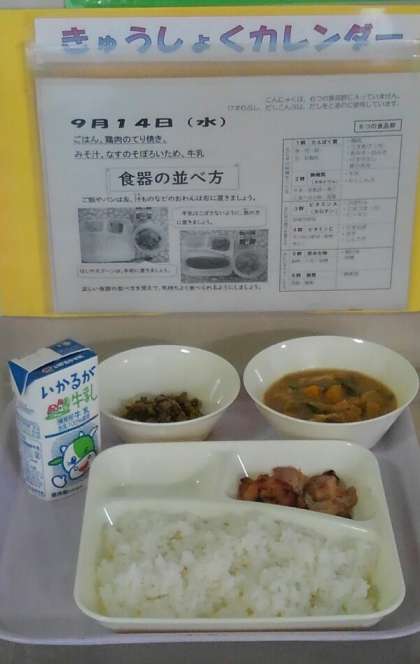 鶏肉のてり焼き みそ汁 なすのそぼろいため ごはん 牛乳