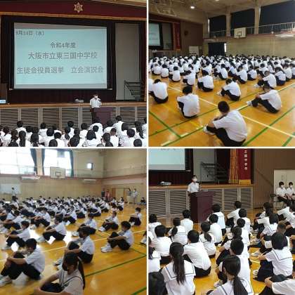 今日の6限に行われた生徒会役員選挙の立会演説会の様子です。どの立候補者、応援演説者もしっかりアピールできていました。