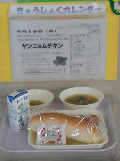 ヤンニョムチキン もやしととうふのスープ 切干しだいこんのナムル 大型コッペパン 牛乳 りんごジャム