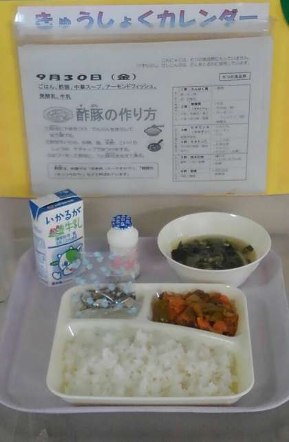 酢豚 中華スープ アーモンドフィッシュ 発酵乳 ごはん 牛乳