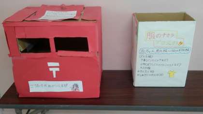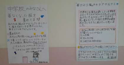 5年生がつくったポスターと回収用のボックスを、職員室から北館へ向かう廊下に設置しています。もし着られなくなった子ども服などありましたら、ご協力よろしくお願いいたします。