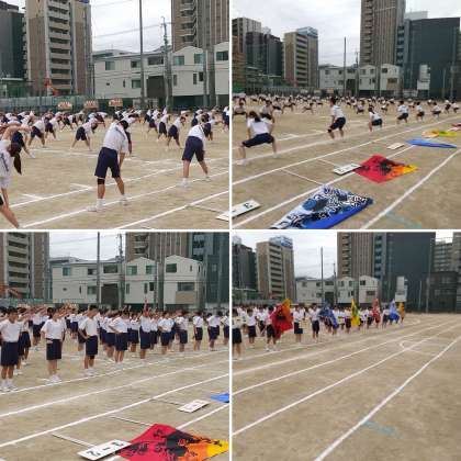 プログラム1番、合同体操の様子です。この後各競技の練習があり、係生徒のリハーサルも行われます。