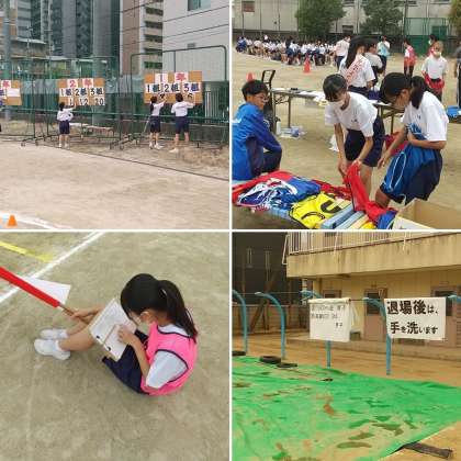 招集係は丁寧にゼッケンをたたんでいます。手洗いの呼びかけもしていました。得点係は本部と連携しながら得点掲示をしています。