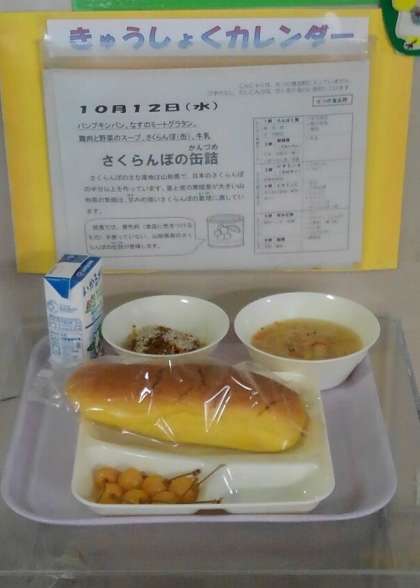 なすのミートグラタン 鶏肉と野菜のスープ さくらんぼ(缶)