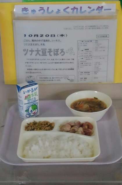鶏肉のゆず塩焼き ソーキ汁 ツナ大豆そぼろ ごはん 牛乳