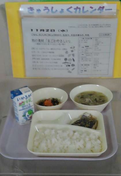 さごしのごまじょうゆかけ 五目汁 大豆の煮もの ごはん 牛乳