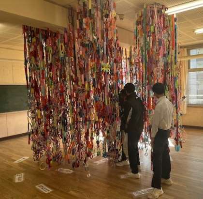 3年生の「空間を彩るモビールアート」です。みんなで力を合わせて、苦労を重ねて完成させました。