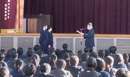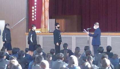 今朝は表彰が2種類ありました。一つは先日の文化発表会のクイズの優秀班の表彰です。展示作品を鑑賞しながら、実行委員の考えたクイズに班で協力して解答した結果、2年1組の班が優勝と第2位というすばらしい成績を収めました。