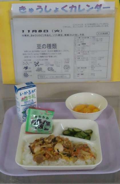 中華丼 きゅうりのピリ辛あえ ソフト黒豆 黄桃(カット缶) ごはん 牛乳