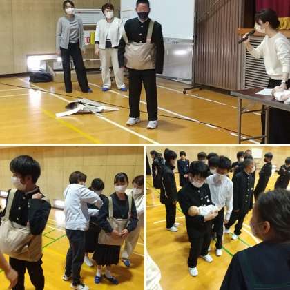 本日の午後、西淀川区の千船病院より助産師の方に来ていただき、1年生の男女共生教育の学習を行いました。スライドや動画を見ながらお話を聞いた後、赤ちゃん人形や妊婦ジャケットを使用して実際に体験することで、生命の大切さをあらためて強く感じることができたのではないでしょうか?