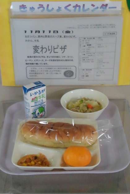 豚肉と野菜のスープ煮 変わりピザ みかん おさつパン 牛乳