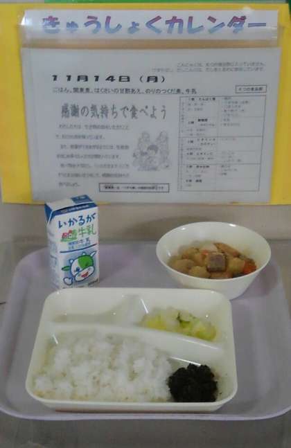 関東煮 はくさいの甘酢あえ のりのつくだ煮 ごはん 牛乳